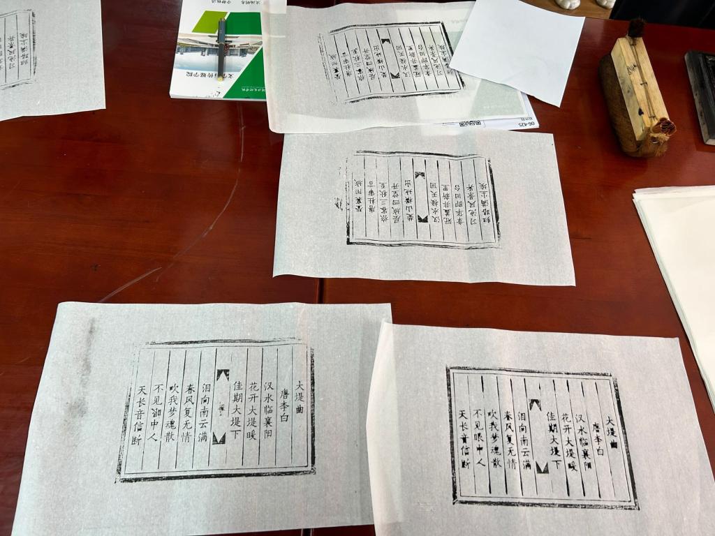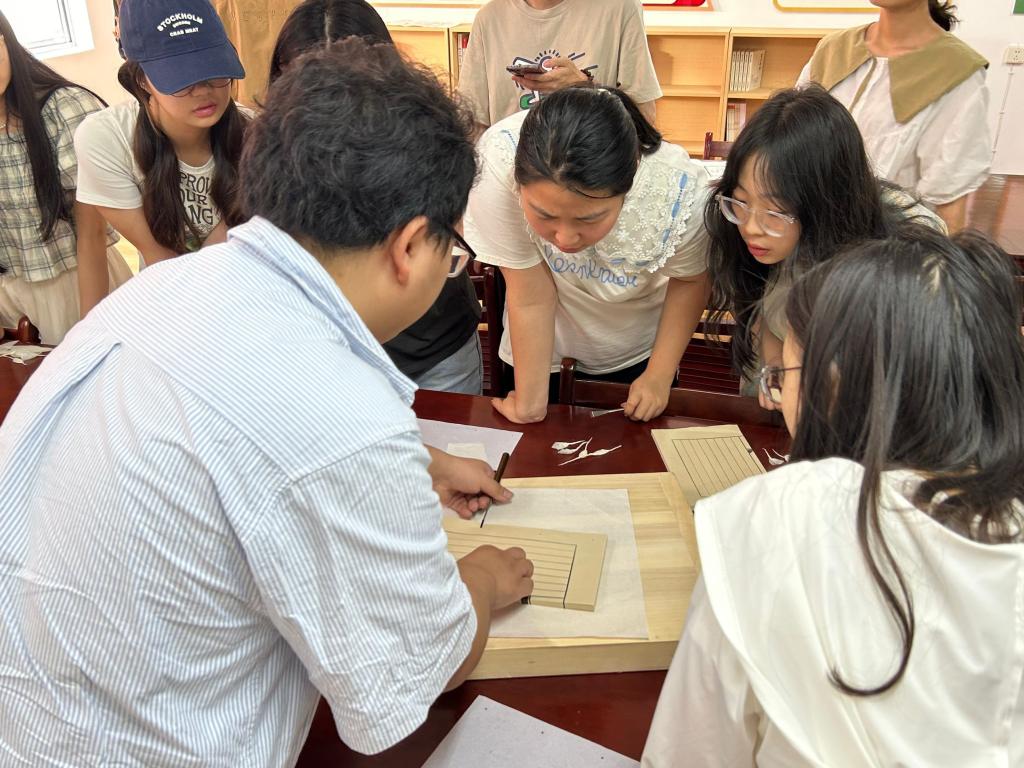 来自襄阳市图书馆古籍部主任黄雪松、古籍部馆员胡梓秋、特藏部馆员李雪西三位老师,为大家介绍了中国古籍的装帧形式,演示了雕版印刷术的基本方式。雕版印刷术是中国古人的重要发明,是在版料上雕刻图文进行印刷的技术;线装书是指以线类进行装订的图书类型,是中国古籍的一种装帧形式。同学们现场分组体验了活字印刷技术和装订成册的流程。