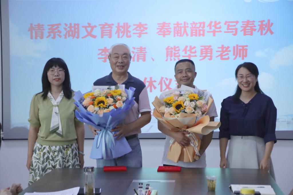 仪式上,苏顺强为两位荣休教师颁发荣休证书,教师代表、学生代表为两位教师献花并合影留念。全体班子成员,教师代表高新伟、陈晓燕、郑晓锋、毕翔,学生代表聂微纷纷回忆了在工作生活等方面李定清老师给予的细致关心和指导;讲述了熊华勇老师平易近人、关爱学生,任劳任怨、甘于奉献、兴趣广泛的生动故事。