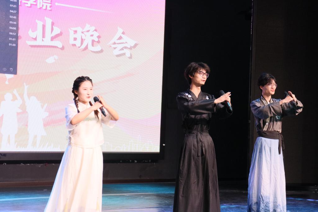 回望过去,祝福未来,经过精心筹备,学院毕业晚会如约而至。晚会节目形式多样,动感活力的舞蹈、有内容有气度的“诗词对弈”、饱含离别之情的民乐演奏《送别》、感情充沛的诗朗诵《迎接一个迷人的春天》:即使冰雪化了以后,道路是泥泞的,即使要穿过一大片沼泽地带,我们也要去欢迎她,因为她给我们带来了温暖和希望。还有师生深情联唱,为毕业生送上美好祝福。