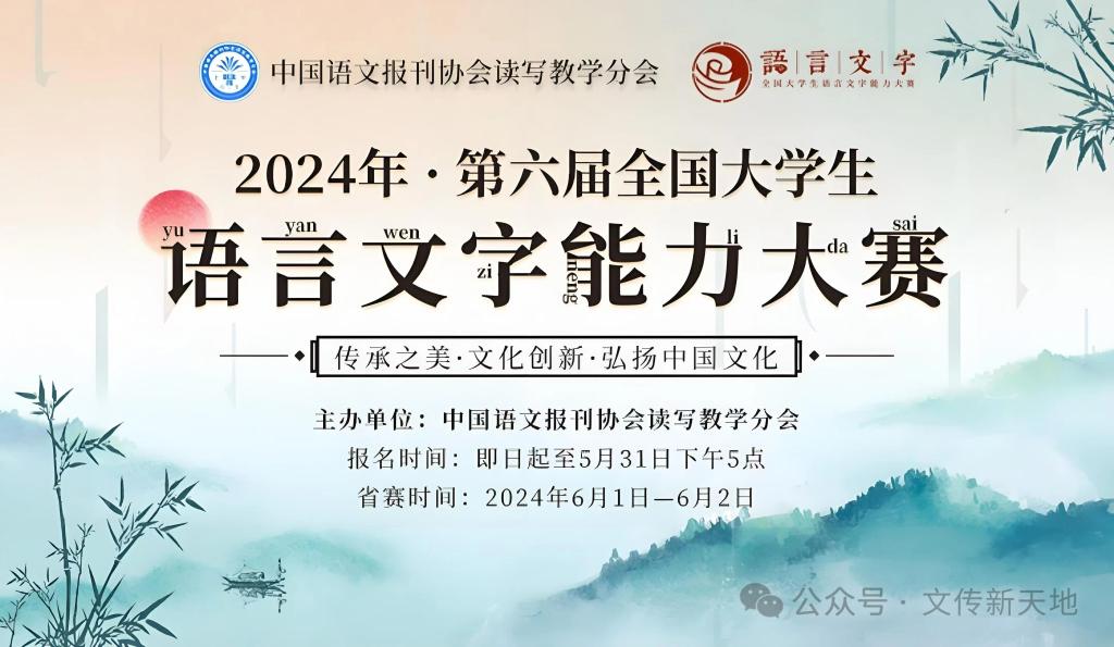 第六届全国大学生语言文字能力大赛由中国语文报刊协会读写教学分会主办,旨在测试大学生的语言文字知识和应用能力,弘扬中国文化,增强大学生规范使用国家通用语言文字的意识,促进语言文字教、学、测协调发展。大赛共设有专业组、非专业组、专科组三个组别,每组分开评奖,公平公正。