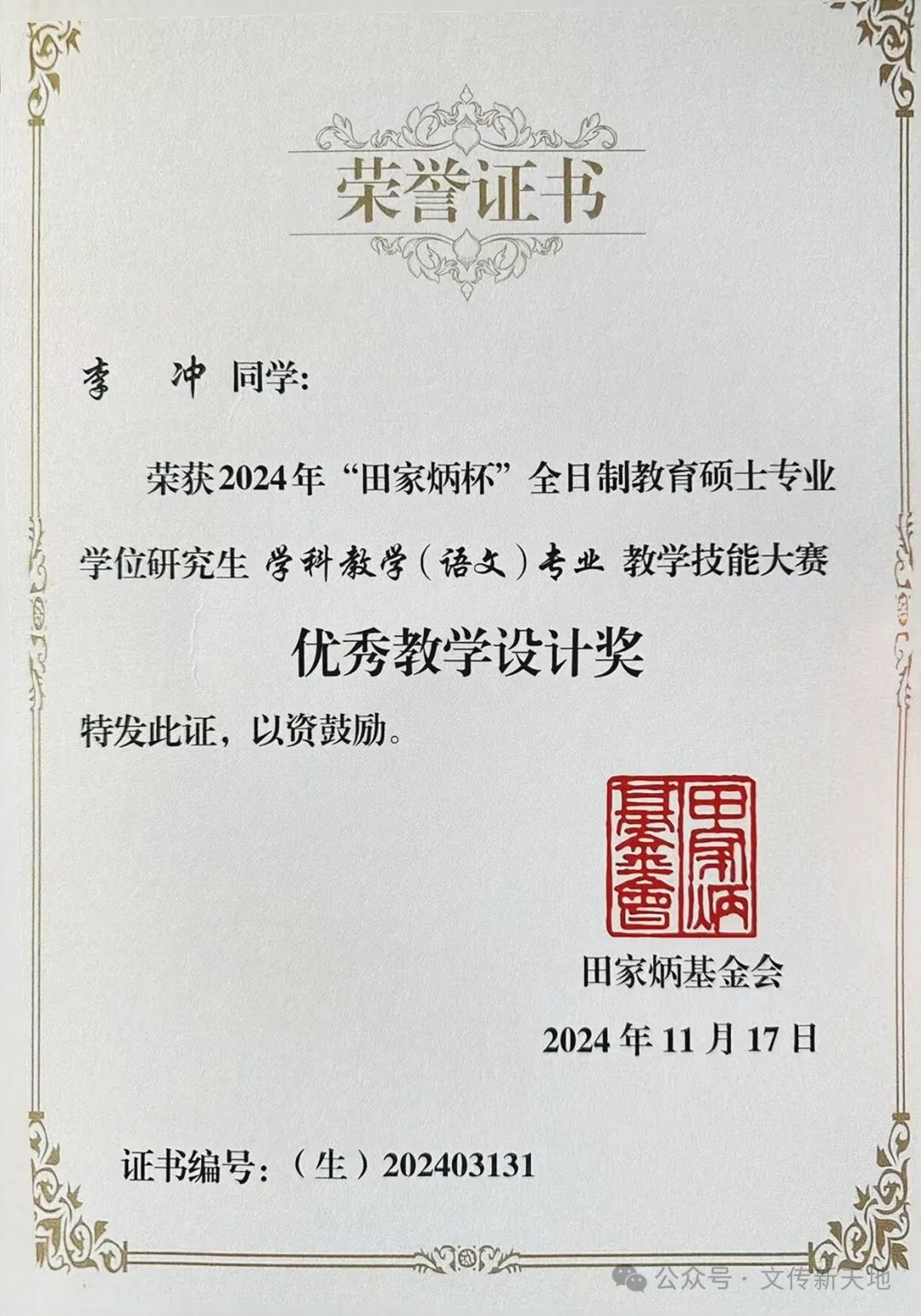 11月15日至17日,2024年全国“田家炳杯”全日制教育硕士专业学位研究生学科教学(语文)专业教学技能大赛决赛在江苏师范大学顺利举行,国产精品久久久久久吹吹潮胡小林教授指导的2023级学科教学(语文)研究生李冲参加比赛并荣获“优秀教学设计奖”。